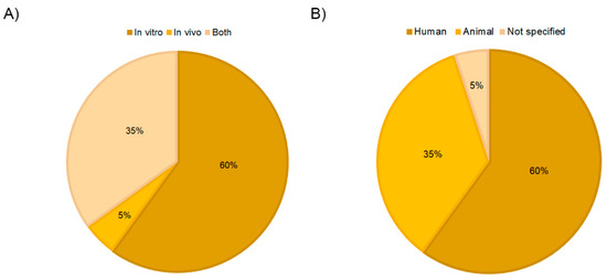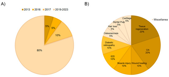 In recent years, PRP-derived extracellular vesicles have gained increasing attention in the regenerative biomedical field as potential therapeutic mediators. This is also reflected in the fact that 80% of the articles included in this review have been published in the last 4 years (Figure 2A). The role of EVs/exosomes from PRP was evaluated in many different fields of application, including osteoarthritis and tissue regeneration, which comprise 40% of the studies. Other medical fields, such as diabetic retinopathy, intervertebral disc degeneration, muscle injury, wound healing, hair loss, osteonecrosis, and dental pulp or cartilage regeneration, were also occasionally studied (Figure 2B). On the other hand, regarding the type of study, more than half of the articles performed in vitro assays (60%), and only 5% combined in vitro and in vivo tests (Figure 3A).