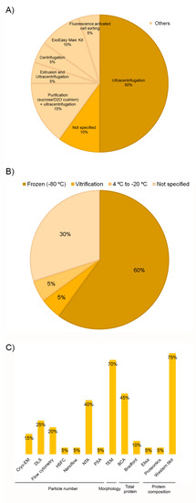 Distribution of the selected publications according to EVs isolation methods (A), storage temperature (B), and characterization methods (C).