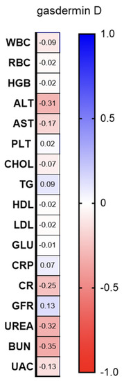 Correlations between serum-GSDMD concentration and basic laboratory parameters. WBC, white blood cells; RBC, red blood cells; HGB, hemoglobin; ALT, alanine transaminase; AST, asparagine transaminase; PLT, platelets; Chol, total cholesterol; TGs, triglycerides; HDL, high-density lipoprotein; LDL, low-density lipoprotein; GLU, fasting glucose; CRP, C-reactive protein; CR, creatinine; GFR, glomerular filtration rate; BUN, blood urea nitrogen; and UAC, uric acid.