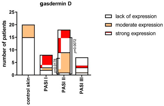 After the division into three subgroups according to PASI (Figure 6), we did not observe significant differences between the extent of GSDMD expression in the samples in each of the PASI subgroups. In the PASI II subgroup, the strong and moderate expressions were significantly more prevalent than the samples lacking this expression (p < 0.01 and p < 0.05, respectively).