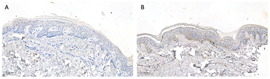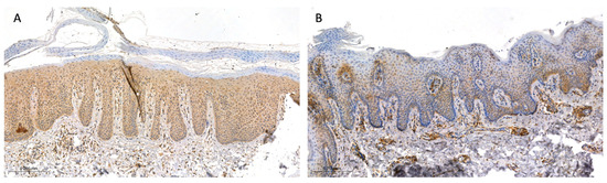 The tissue sample collection was performed in 33 patients with psoriasis and 20 sex- and age-matched volunteers without dermatoses considering that not every patient agreed to perform the biopsy. This study group was further divided, similar to the subjects who donated serum and urine, into three subgroups depending on the severity of the disease: PASI I (PASI < 10)—mild psoriasis, with 8 patients; PASI II (PASI 10–20)—moderate psoriasis, with 18 patients; and PASI III (PASI > 20)—severe psoriasis, with 7 patients. All participants did not apply any topical drugs on their skin for at least a month before the biopsy. Biopsies were taken from the trunk in all participants with a 4 mm punch after local anesthesia with 2% lignocaine. In the patients, two biopsies were taken: one from the lesional skin—the psoriatic plaque—and the other one from the non-lesional, clinically healthy skin, approximately 2 cm from the psoriatic plaque. As for the controls, one skin sample was taken from the non-lesional skin and the sampling was performed during the surgical removal of benign skin lesions. Tissue samples were then fixed in 10% buffered formalin solution. After preservation, they were embedded in the paraffin blocks and cut into 4 µm sections on silanized slides. The next step was an overnight incubation at 60 °C, deparaffinization, and rehydration of the tissues. Slides were then incubated with 3% hydrogen peroxide solution to block endogenous peroxidase and with protein block to avoid non-specific antibody binding. Next, tissues were incubated with the rabbit polyclonal anti-human GSDMD antibody (dilution 1:50, Sigma-Aldrich®, Saint Louis, MI, USA, HPA0444487) for 30 min at room temperature. Then, post-primary block and Novolink polymer were used (Leica Novolink Polymer Detection System®, Deer Park, IL, USA). The protein expression was visualized with Novolink DAB solution and cell nuclei with hematoxylin (Leica Novolink Polymer Detection System®, USA). The expression of GSDMD was presented using a semi-quantitative method and the reaction was observed in the epidermis as follows: 0—no expression; 1—moderate, up to 30% keratinocytes, except for the stratum basale and corneum; and 2—strong, in the whole epidermis, except for the stratum corneum. Among the psoriatic plaques, 18 patients exhibited strong expression, 12 patients—moderate, and 3 patients—no expression. Among the non-lesional skin samples, 7 patients exhibited strong expression, 10 patients—moderate, and 16 patients—no expression. In the control group, 5 participants exhibited moderate expression and 15 participants—no expression. Figure 7A presents the strong expression of GSDMD, whereas Figure 7B presents the moderate expression of GSDMD in psoriatic plaque (Figure 7A,B). Figure 8 presents the expression of GSDMD in the epidermis of the healthy skin of the controls (Figure 8A,B).