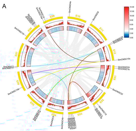 Collinearity analysis of SmCNGCs. (A) Chromosome locations and inter-chromosomal associations of SmCNGC genes. The colored lines represent different sets of collinear genes. The gene density in the chromosome is also depicted in the graph, with red indicating high density and blue indicating low density. (B) Collinearity analysis of CNGC genes between eggplant and the other two representative plants. The syntenic gene pairs were linked by blue lines.