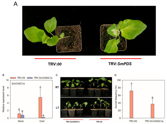 The VIGS method referred to in previous studies [47] was employed. RNA was isolated from the leaves of pTRV2-SmCNGC1a-silenced plants and pTRV2 negative control plants, followed by qRT-PCR analysis to assess the silencing efficiency of SmCNGC1a. Cold-stress treatment was conducted according to the procedure outlined in Section 2.6. After 2 h treatment, the phenotypes of eggplant seedlings were observed under different experimental conditions, and the survival rates were calculated.