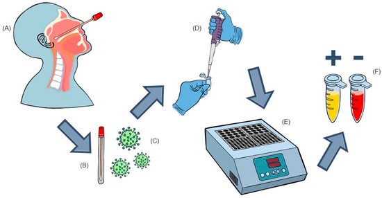 Schematic view of sample collection, transportation, and RT-LAMP analysis. (A)—Nasopharyngeal sample collection. (B)—Sample is transferred to a tube containing 2 ml of sterile saline. (C)—A 1 mL aliquot was transferred to a cryotube and kept frozen until RT-LAMP analysis. (D)—Thawed sample added directly to the RT-LAMP mix (New England Biolabs®, Ipswich, MA, USA). (E)—Tubes were incubated at 63 °C for 45 min. (F)—After incubation, the yellow color indicates positivity for SARS-CoV2, while the red color indicates a negative test.