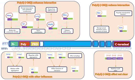Following the discovery that the mutant huntingtin (HTT) protein causes HD and is ubiquitously distributed in the body, many researchers began searching for HTT-interacting proteins. One such protein is HAP1, which is enriched in the brain and was the first reported HTT-interacting protein [30]. Subsequently, many other HTT-interacting proteins have been identified, some of which are neuronally-enriched while others are not. Additionally, some interactions are enhanced by polyQ expansion, while others do not show this enhancement [3,4]. Many of these studies have been conducted using rodent models, human cell lines, and drosophila models for confirmation. Only a few interactions have been discovered through human tissue studies [88,89,90].