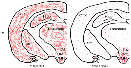 - Liu, Q.; Cheng, S.; Yang, H.; Zhu, L.; Pan, Y.; Jing, L.; Tang, B.; Li, S.; Li, X.-J. Loss of Hap1 selectively promotes striatal degeneration in Huntington disease mice. Proc. Natl. Acad. Sci. USA 2020, 117, 20265–20273. [Google Scholar] [CrossRef]