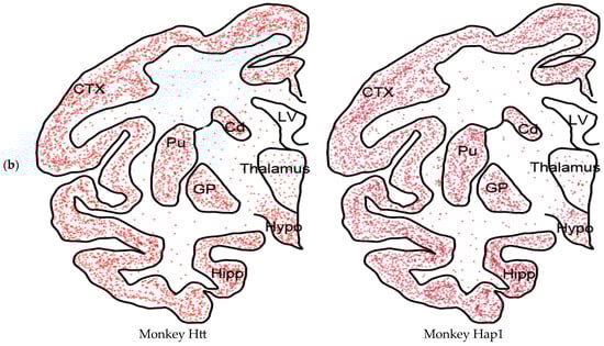 Schematic illustration of the expression pattern of HTT and HAP1 in mouse and primate brains. Red dots represent the densities of HTT or HAP1 in the mouse (a) and primates brain (b) areas. Aberiviations are: CTX: cortex, Str: Striatum; Amy: Amygdala; Hipp: Hippacampus; DA: dorsal hypothalamus; DM: dorsomedial hypothalamus; VHM: ventral medial hypothalamus; Pu: putamen; Cd: caudate nuclears; Gp: globus pallidus; Hypo: Hypothalamus; LV: lateral ventricle.