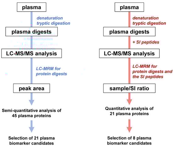 - Kuzyk, M.A.; Smith, D.; Yang, J.; Cross, T.J.; Jackson, A.M.; Hardie, D.B.; Anderson, N.L.; Borchers, C.H. Multiple Reaction Monitoring-Based, Multiplexed, Absolute Quantitation of 45 Proteins in Human Plasma. Mol. Cell. Proteom. 2009, 8, 1860–1877. [Google Scholar] [CrossRef] [PubMed]