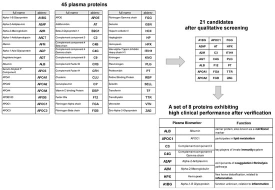 The initial step of biomarker screening involved determining the relative protein concentrations in plasma by calculating the peak area ratio over the average peak area. Plasma samples from these participants were pretreated, and plasma proteins were digested using trypsin. The resulting tryptic digests were analyzed using an LC-MS/MS system (LCMS-8060; Shimadzu, Kyoto, Japan) (Figure 1). We further refined the selection process using synthetic peptides for precise quantification. At each stage, multinomial regression and receiver operating characteristic (ROC) analyses were employed to evaluate the clinical performance of biomarker candidates.