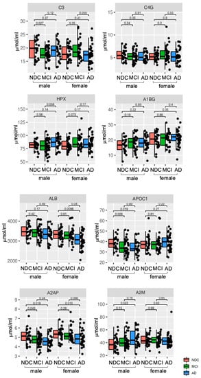 Plasma levels of eight biomarker proteins in NDC, MCI, and AD. Plasma levels of the eight biomarker proteins for male and female participants are presented for NDC (red box), MCI (green box), and AD (blue box). Within the boxplot, the bold solid bars denote the mean abundance of each group, while the error bars delineate ± 1.5 SD. Significant variations among the three groups are highlighted, as determined by the Kruskal–Wallis U test. p values are indicated.