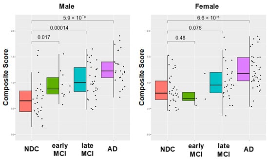 Composite scores calculated from concentrations of eight plasma biomarkers in disease progression. Composite scores designed using logistic models for discrimination between either NDCs and those with MCI or NDCs and those with AD exhibited a correlation with severity of cognitive decline based on clinical manifestations in both male and female participants.