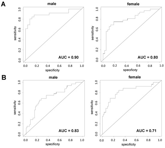 Clinical potential of composite score consisting of eight plasma proteins. ROC analysis of composite score consisting of eight plasma proteins in male and female participants evaluated using coefficients of the logistic models was performed. In the model discriminating between NDCs and those with AD, the AUC values of ROC analysis were 0.90 and 0.80 for male and female participants, respectively (A). In the model discriminating between NDCs and cognitive impairment (MCI and AD), the AUC values from the ROC analysis were 0.83 and 0.71 for male and female participants, respectively (B).
