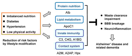 Plasma biomarker panel for dementia prevention. Plasma biomarkers found in present study were categorized into four functional groups. Alb was associated with protein nutrition, ApoC1 with lipid metabolism, C3 and C4G with innate immunity, A2AP and A2M with coagulation/fibrinolysis, HPX with heme detoxification, and A1BG with inflammation.