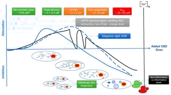 In 2009, Duncan Ryan and colleagues showed that CBD, at 1 µM, could modulate cytosolic calcium concentrations bidirectionally in glial and neuronal cells. It appeared to involve CBD acting directly on the mitochondrion to control calcium flux; the direction, in or out, was dependent on whether the cells were in a hyper-excitable state or not, respectively. Their conclusion was that this was at least partly dependent on the ability of CBD to keep the inner mitochondrial membrane (IMM) NCLX in a confirmation that allowed it to pass these ions more freely. They suggested that under normal conditions, CBD induced the release of calcium from the mitochondrion (and into the cytosol), but in excitable conditions, with high levels of calcium coming into the cell, the mitochondrion effectively acted as a sink for excess calcium. In some of their experiments, they also showed that there was an initial biphasic effect on mitochondrial calcium, where calcium levels initially increased then decreased [167]. In this respect, CBD seemed to modulate mitochondrial calcium signalling resulting in a context-dependent restoration of homeostasis.
