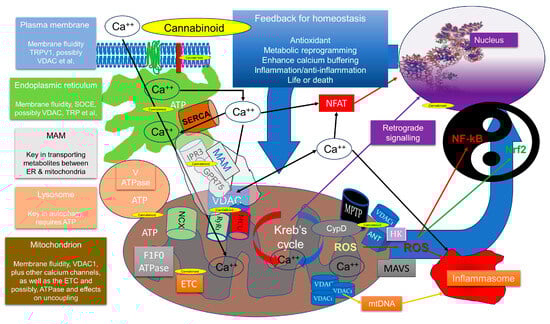 Mitochondria are pivotal in calcium homeostasis and signalling [147], which can be traced back to the origins of eukaryotes [24]. Thus, the finding that CBD modulates multiple ion channels and calcium signalling [3] is perhaps very suggestive. It is well known that ageing is associated with rising inflammation coupled to decreasing mitochondrial function, epitomised by the term “inflammaging”. Recent data show that at least in macrophages, this coupling is strongly associated with a reduced ability of mitochondria to take up calcium, involving the mitochondrial calcium uniporter (MCU), and increased nuclear translocation of NF-κB. This supports the emerging role of mitochondria in calcium signalling and modulation of the immune response [148]. Although data also suggest that THC can also modulate calcium signalling in a non-CBR-dependent way, for instance, via T-type calcium channels, transient receptor potential (TRP) channels and Cav channels [149,150,151], we will focus on CBD because of its known effects on mitochondria. However, as THC does also appear to modulate mitochondrial function, it is also likely to affect calcium signalling in this way too.