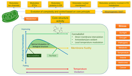 It could be argued that life has evolved around the core properties of molecules like CBD to dissipate excited states, which would imply, de facto, they must also modulate bioenergetics and membrane fluidity. Inflammation can be viewed from the chemiexcitation viewpoint as a mis-flow of electrons disrupting homeostasis that induces a feedback mechanism, which if it does not correct leads to what might be described as “disease”. It could therefore be said that we age and die because our systems slowly lose the ability to adapt, and in this respect, health is about the ability to maintain this adaptability. To some degree, the right amount of stress, embraced by the concept of hormesis, does seem to stimulate this adaptability, as without it, we age faster [20]. This might suggest that compounds like CBD can not only act to “deexcite” a system but can also stimulate it to enhance adaptability by restoring a homeostatic feedback mechanism. From the thermodynamic point of view, this could be related to the restoration of membrane fluidity to its “sweet spot” and optimal dissipation. In a multicellular organism, this could enhance cellular cooperativity, but it could also explain how it could be anti-pathogenic by disrupting membranes of single-celled organisms. This implies that due to concentration effects, it is likely that biological effects could be at least biphasic, with a low dose doing something different to a high dose.