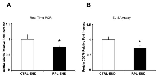 CD276 gene (A) and protein (B) expression levels in endometrial biopsies. (A) Fold change of CD276 mRNA in endometrium tissue samples from the RPL and the control group. (B) Fold change of CD276 protein in endometrium tissue samples from the RPL and the control group. Data are presented as mean ± SE. Significance was calculated using Student’s t-test (* p < 0.05). RPL denotes recurrent pregnancy loss; CTRL-END: endometrial tissue from the control group; RPL-END: endometrial tissue from the RPL group.