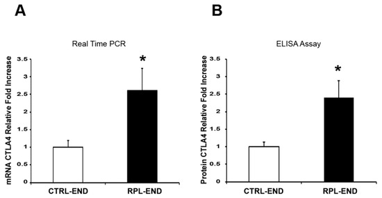 CTLA4 gene (A) and protein (B) expression levels in endometrial biopsies. (A) Fold change of CTLA4 mRNA in endometrium tissue samples from the RPL and the control group. (B) Fold change of CTLA4 protein in endometrium tissue samples from the RPL and the control group. Data are presented as mean ± SE. Significance was calculated using Student’s t-test (* p < 0.05). RPL denotes recurrent pregnancy loss; CTRL-END: endometrial tissue from the control group; RPL-END endometrial tissue from the RPL group.