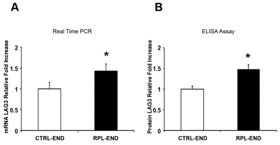 LAG3 gene (A) and protein (B) expression levels in endometrial biopsies. (A) Fold change of LAG3 mRNA in endometrium tissue samples from the RPL and the control group. (B) Fold change of LAG3 protein in endometrium tissue samples from the RPL and the control group. Data are presented as mean ± SE. Significance was calculated using Student’s t-test (* p < 0.05). RPL denotes recurrent pregnancy loss; CTRL-END: endometrial tissue from the control group; RPL-END endometrial tissue from the RPL group.