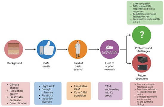 As the global population is projected to reach 9 billion in 27 years, food production has become increasingly limited due to the demanding crop irrigation and the increasingly frequent drought episodes driven by climate change. CAM is a natural innovation for high WUE and stress resilience. In the era of system biology and synthetic biology, engineering the CAM characteristics into C3 (or C4) crops represents a potential breakthrough for meeting the global challenges of population growth and food security. The CAM research areas covered in this review are not mutually exclusive. Instead, they inform each other and deepen our comprehension of the evolutionary and molecular underpinnings of CAM. The C3-CAM transition will provide advantages to plants in the following aspects: 1. water-use efficiency 2. drought tolerance 3. temperature resilience 4. plasticity in photosynthesis 5. carbon storage. Studying the C3 to CAM transition using facultative CAM plants allows going back to evolution history and identifying the molecular switches (e.g., TFs and kinases) essential for the development of CAM characteristics. Once we know the “codes” for the CAM characteristics, we can use the synthetic biology “language” to build cell-type-specific circuitry for enabling important C3 crops with enhanced WUE, stress resilience, and improved yield.