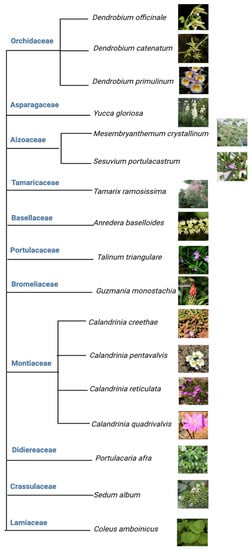 Tree view of all the facultative CAM plants investigated from 2017 to 2023. Source of each image was cited from top to bottom [38,39,40,41,42,43,44,45,46,47,48,49,50,51,52,53], respectively, except that the image of M. crystallinum was from the Chen lab.