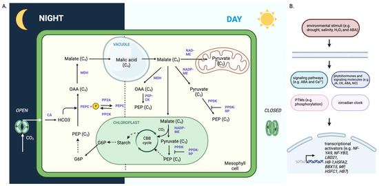 With the advances in high-throughput omics technologies and computational biology, systems biology has become a prevalent approach for discovery (hypothesis generation) and functional studies (hypothesis testing). Beyond traditional physiological and biochemical methods, multi-omics (genomics, transcriptomics, proteomics and metabolomics) has generated a systems-level understanding of temporal molecular and metabolic controls underpinning CAM [75]. In T. triangulare leaves, targeted metabolite profiling and RNA sequencing were performed to reveal the rewiring of carbohydrate metabolism and candidate transcription factors (TFs) in the drought-induced CAM transition process [76]. Three years later, the same group identified seven candidate regulators of ABA-induced CAM including HEAT SHOCK TF A2, NUCLEAR FACTOR Y, SUBUNITS A9, and JmjC DOMAIN-CONTAINING PROTEIN 27 [77]. In addition to the traditional drought and salt induction of CAM, hydrogen peroxide was shown to be able to induce CAM in M. crystallinum [35]. In the leaves of another facultative bromeliad Guzmania monostachia, increases in the expression of CAM-related genes (PEPC1, PPCK, NAD-malate dehydrogenase, aluminum-activated malate transporter 9 (ALMT9), PEP carboxykinase (PEPCK)) and UREASE transcripts were shown under drought. And the role of integrating N and C metabolism of urea was suggested [78]. The CAM gene expression, antioxidant activities, and chlorophyll fluorescence were compared between a C3-CAM facultative species (Sedum album) and a C4-CAM facultative species (Portulaca oleracea) [79]. The level of nitric oxide (NO) was found to be correlated with the CAM expression during CAM induction only in S. album but not P. oleracea. This suggests the different roles of NO in C3 and C4 species during CAM induction. All the aforementioned studies did not identify a critical transition period, which is key to capturing the molecular switches for CAM. Three years ago, the transition period of M. crystallinum was first defined during salt-induced C3 to CAM shift, and further validated in independent studies through RNA-seq and physiological analyses [19,20,67]. Interestingly, three phytohormones, jasmonic acid (JA), cytokinin, and ABA were reported to play important roles in the inversed pattern of stomata opening/closing during the transition of M. crystallinum [67]. With the release of the ice plant genome [62], more studies can explore the genes and metabolites pertinent to the C3 to CAM transition.