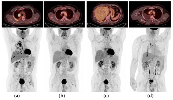 The pictures present four assessments performed during treatment of case 1. (a) Baseline positron-emission tomography (PET)/computed tomography (CT): A 5 cm 18F-Fluoro-deoxy-glucose (FDG)-avid tumor in the pulmonary upper right lobe and extensive metastatic spread including multiple small lesions in both lungs, multiple right-sided pleural lesions, mediastinal and right hilar lymph nodes, and several retroperitoneal lymph nodes. (b) After 6 months: PET/CT shows complete metabolic and considerable structural regression of all prior lesions. (c) At 9 months, control PET/CT shows, posteriorly, on the right side, an intense FDG uptake in relation to the pleura and pleural effusion, without any evident tumor seen on CT. The finding was suspicious for relapse. (d) Metabolic and structural progression of primary tumor in the right lung. Malignant mediastinal and right hilar lymph nodes. Increased metabolic activity posteriorly in the increasing right-sided pleural effusion—suspicion of malignant pleural effusion.