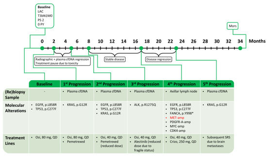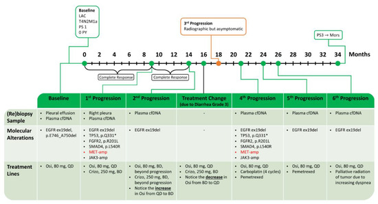 The patient was treated for 5 months, achieving complete clinical and radiographic response, despite the significant genomic co-alterations. However, a cfDNA control sample showed persistent EGFR ex19del with a VAF increasing to 3.68%, a finding that can predict worse survival and impending progression [33]. Accordingly, the patient was offered to escalate the dose of Osimertinib (80 mg BD) while continuing Crizotinib, but that was feasible for only two months due to toxicity (grade 3 diarrhea), which necessitated resuming the initial Osimertinib dose. The liquid biopsies taken every second month continuously revealed the persistence of the EGFR ex19del in the cfDNA. Next FDG-PET/CT performed nine months after combination treatment showed intrathoracic progression (Figure 1d), but the patient was asymptomatic and continued the treatment beyond progression during the following three months, after which further intrathoracic progression was observed. Examination of the malignant pleural effusion showed the previous mutational profile, i.e., EGFR ex19del, MET amplification (76% of tumor cells with >6 copies, average MET-GCN/cell of 10.3, >10% with MET gene clusters), JAK3 amplification, and TP53, FGFR2, and SMAD4 mutation. All these co-alterations could represent mechanisms of resistance to the Osimertinib–Crizotinib combination, yet they were not obvious druggable targets. Thus, Crizotinib was discontinued after 12 months, and the patient began chemotherapy with Carboplatin and Pemetrexed, while continuing Osimertinib. After four cycles, clinical and radiographic regression was observed, but the newly sampled cfDNA displayed persistence of EGFR ex19del at a low VAF (0.28%). The patient continued maintenance Pemetrexed together with Osimertinib; however, further progression of the T-site and remaining circulating EGFR ex19del (AF 0.18%) were observed after two months. Due to increasing dyspnea, the patient received palliative radiation against the progressing lung tumor (3 Gy × 10 fr) and, given the persistent and increasing circulating EGFR ex19del (VAF 1.7%), he continued Osimertinib. The patient’s condition deteriorated quickly, and he died after having reached an OS of 34 months. A schematic time course of this case is shown in Figure 2.