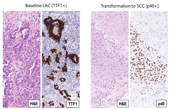 NSCLC histological phenotypes in case 3. Left panels: Diagnostic biopsy (baseline) from a metastasis to the thoracic lymph nodal station 4R with phenotype of lung adenocarcinoma (LAC); hematoxylin-eosin staining (H&E) shows malignant adeno-papillary structures, which are positive for the immunohistochemical LAC biomarker TTF1 (TTF1). Right panels: Rebiopsy from progressive metastasis in the left lung shows tumor transformation to squamous cell carcinoma (SCC); hematoxylin-eosin staining (H&E) shows a solid, slightly keratinizing tumor tissue, which is positive for the immunohistochemical SCC biomarker p40 (p40). (All magnifications, ×200).