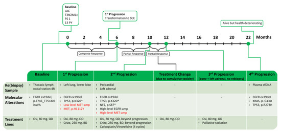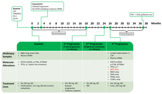 A 75-year-old female, smoker (20 py), in a PS of 2, with well-treated hypertension, was diagnosed with LAC in the right lung’s lower lobe with multiple brain and bone metastases and EGFR ex19del (p.E746_A750del) and TP53 (c.673-2A>G, p. potentially affecting the 5’ end splice site of exon 7) co-mutations. A baseline liquid biopsy (plasma cfDNA) showed shedding of the EGFR ex19del. The patient was neurologically stable on steroids (Prednisolone 12.5 mg QD) and no additional radiation therapy was needed. She initiated first-line Osimertinib (80 mg QD), and first assessment following three months of treatment showed subtotal regression of cerebral metastases and extracranial PR together with disappearance of the EGFR ex19del from the cfDNA. After 18 months of remission, an isolated progression of the T-site was observed, and the patient received palliative local radiation therapy (3 Gy × 10 fractions) while continuing Osimertinib. At the 24-month assessment, growth of a single brain metastasis was observed, and the patient received supplementary SRS radiotherapy (18 Gy × 1 fraction). At the 26-month assessment, oligoprogression was detected intrathoracically (Figure 9a). cfDNA analysis showed the reappearance of the EGFR ex19del (VAF 7.82%). The patient continued Osimertinib beyond progression. Rebiopsy from new metastases in thoracic lymph nodal stations 7 and 11R revealed acquired MET overexpression (MET-IHC with 3+ in 80% and 2+ in 20% of tumor cells) associated with high-level MET amplification identified by FISH (average MET-GCN/cell = 8.04, 77% of tumor cells with ≥6 copies, 15% of tumor cells with clusters), whereas only 5 MET gene copies were detected by NGS. This was accompanied by co-amplification of the BRAF (five copies), SMO (five copies), and PMS2 (five copies) genes on chromosome 7 (like the MET gene), as well as amplification of the CCNE1 gene (seven copies) on chromosome 19. Furthermore, the original TP53 mutation was also found, whereas neither phenotypical transformation nor druggable fusions were detected. The patient initiated Crizotinib (250 mg QD) while continuing Osimertinib (40 mg QD), and after three months of this combination treatment, FDG-PET/CT revealed PR (Figure 9b). The treatment was continued without adverse events and with excellent quality of life for a further eight months, after which the patient’s condition deteriorated. The treatment was discontinued due to PS 3, and the patient continued palliative care without further antineoplastic treatment. The patient had hitherto reached an OS of 37 months. A schematic time course of this case is shown in Figure 10.