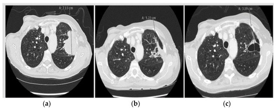 The figure presents three CT scans of the thorax under the treatment course of case 3. “A” represents the lung tumor. (a) Tumor progression on Osimertinib–Alectinib. (b) Significant tumor regression after three months of combination treatment with Crizotinib and Osimertinib. (c) Further tumor regression after six months of treatment with Crizotinib and Osimertinib.