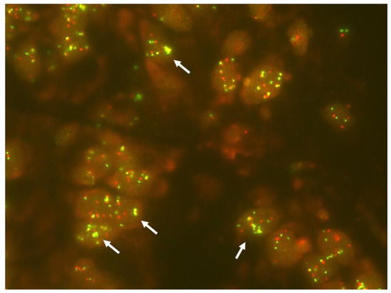 FISH analysis of a rebiopsy from relapsed NSCLC in the right lung at progression on third-line Osimertinib in case 4. High-level MET amplification with several tumor cell nuclei exhibiting MET gene clusters (arrows), which by convention correspond to >15 copies. (Magnification, ×1000).