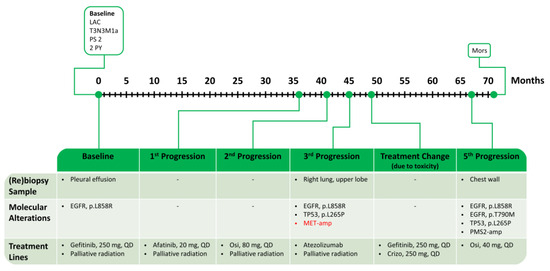 Inclusion of the patient in the SAVANNAH trial with the MET-TKI Savolitinib was considered, but the patient declined this possibility. Thus, he was treated with immunotherapy (three cycles of Atezolizumab stretched over four months), resulting in further progression. The combination of EGFR- and MET-TKI was reconsidered. As the patient had experienced gastrointestinal toxicity with Osimertinib, Gefitinib rechallenge together with Crizotinib was initiated. The patient responded for 18 months with an excellent quality of life and no evident adverse events. Thereafter, new progression occurred, and a new rebiopsy from a metastatic lesion in the chest wall revealed, in addition to the founder EGFR p.L858R and the previously identified TP53 p.L265P variants, loss of MET amplification and a newly acquired EGFR p.T790M mutation, as well as PMS2 amplification (five copies). Based on these findings, Gefitinib and Crizotinib were discontinued and a re-challenge with Osimertinib in reduced dose of 40 mg QD was initiated. However, the patient’s PS quickly deteriorated, and he deceased after four months. The patient reached an OS of 71 months. A schematic time course of this case is shown in Figure 8.