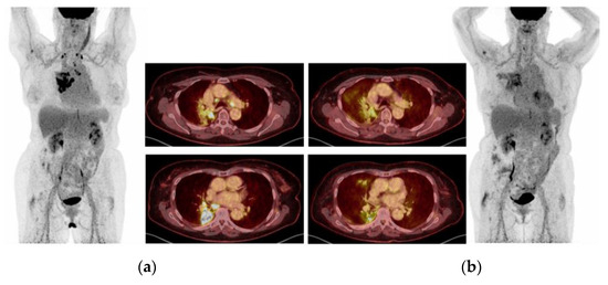 The pictures present the progression after 26 months of Osimertinib treatment in case 5 (a) and response to Osimertinib and Crizotinib (b). (a) Malignant tumor centrally in the right lung. Lymph nodes suspected of malignancy in the right hilus, mediastinum, and at the base of the neck bilaterally. (b) Marked regression of metabolic activity in the lung tumor. Complete metabolic remission of previously suspected malignant lymph nodes in the right hilus, mediastinum, and at the base of the neck.