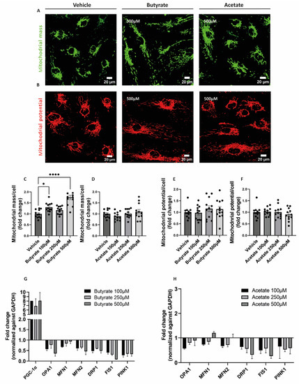 2.3. Butyrate Increases Mitochondrial Mass and Influences the Expression of Genes Involved in Mitochondrial Homeostasis in hgMVECs
