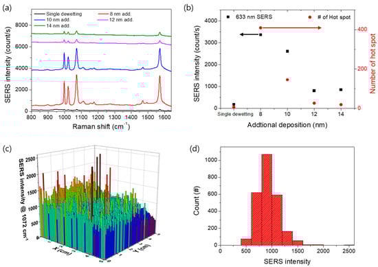 (a) SERS spectra of benzenethiol measured for each dewetting substrate. (b) SERS intensity of the 1072 cm−1 peak of benzenethiol (black squares) and number of hotspots (gaps below 10 nm) in a 4.8 µm2 area (red circles) as a function of additional deposition thickness and number of gaps smaller than 10 nm for each dewetting substrate. (c) Raman mapping data of a 5 cm × 5 cm large−area substrate subjected to dual−dewetting with 8 nm additional deposition at 1 mm intervals. (d) Histogram of SERS intensity from the mapping in (c).