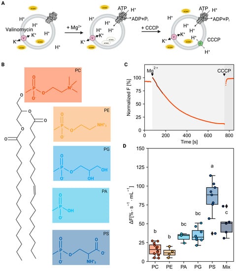 - Dufour, J.P.; Goffeau, A.; Tsong, T.Y. Active Proton Uptake in Lipid Vesicles Reconstituted with the Purified Yeast Plasma Membrane ATPase. Fluorescence Quenching of 9-Amino-6-Chloro-2-Methoxyacridine. J. Biol. Chem. 1982, 257, 9365–9371. [Google Scholar] [CrossRef] [PubMed]