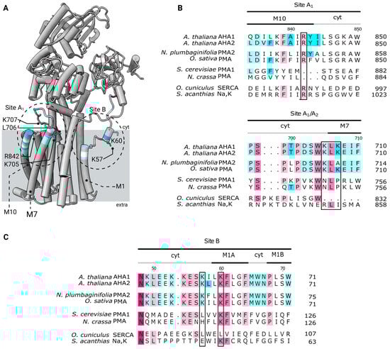- Buch-Pedersen, M.J.; Palmgren, M.G. Conserved Asp684 in Transmembrane Segment M6 of the Plant Plasma Membrane P-Type Proton Pump AHA2 Is a Molecular Determinant of Proton Translocation. J. Biol. Chem. 2003, 278, 17845–17851. [Google Scholar] [CrossRef]
