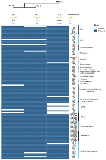 LmAV-2 and LmAV-6 were also identified as clonal complex 3 (CC3) associated with a human clinical infection and animal listeriosis with severe manifestations. The clonal complexes (CCs) such as CC1, CC2, CC3, CC4, CC6, CC59, CC77, and CC224 of L. monocytogenes collected from food and clinical strains can be associated with human systemic infections and neurological forms of listeriosis [1,25]. Moreover, LmAV-3 was identified as CC945, more common in lineage II of L. monocytogenes strains associated with food contamination and the environment. Louha et al. [26] showed that most L. monocytogenes isolates from broad river watersheds belong to lineage II (68%). In these isolates, 23 different CCs were identified, with 5 CCs (CC945, CC14, CC901, CC912, and CC910) predominating. Likewise, Kim et al. [23] detected LIPI-4 in lineages I and III, and clonal complexes isolated CC4, CC87, CC213, CC217, CC363, CC382 and CC1002. Hence, the behavior of the serotypes involved in outbreaks or cases of listeriosis depends on the geographical distribution, genetic diversity, and virulence profiles of L. monocytogenes, epidemic clones of strains, type of food and source environments, and processing conditions in the food chain.
