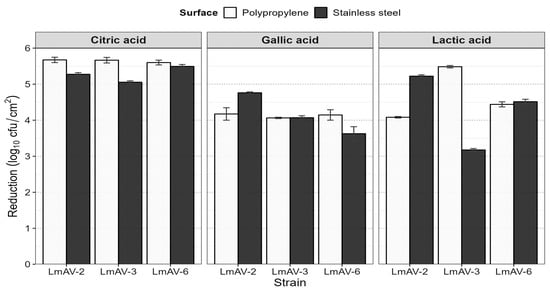 L. monocytogenes strains presented multi-resistance to a wide range of groups of antibiotics such as penicillins and lincosamides (Table 2); however, LmAV-2, LmAV-3, and LmAV-6 were susceptible to ciprofloxacin, erythromycin, chloramphenicol, tetracyclines, gentamicin, trimethoprim–sulfamethoxazole, and vancomycin. Subsequently, the MBC was determined for all three strains of L. monocytogenes evaluated LmAV-2, and LmAV-6 was determined to be 1 mg/mL for LA; however, the MBC for LmAV-3 was 0.5 mg/mL. The MBC of all L. monocytogenes strains was determined to be 0.5 mg/mL for CA and 2 mg/mL GA (Table 3). The MIC of QACs was 6.25 ppm and the MBC was 100 ppm for all strains. Further, in this study, the tested microorganisms (LmAV-2, LmAV-3, and LmAV-6) showed an ability to develop biofilms in PP (8.86–8.99 log10 cfu/cm2) and SS (8.74–9.08 log10 cfu/cm2) at 240 h (p > 0.05). In addition, treatment with GA, CA, and LA was applied at 22 °C with one time of exposure at 10 min, determining that CA has a greater removal of biofilm of L. monocytogenes strains (5.46 log10 cfu/cm2; p < 0.05) in comparison to LA (4.48 log10 cfu/cm2) and GA (4.13 log10 cfu/cm2). Furthermore, there was no significant difference in the reduction of biofilm in LA and GA (p > 0.05) (Figure 2). Regarding the behavior of LmAV-2, LmAV-3, and LmAV-6 strains, there is no significant difference in the reduction of biofilm (p > 0.05).