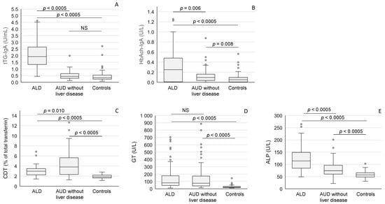 Anti-tTG IgA antibodies (A), anti-acetaldehyde-adduct IgA (HbAch-IgA) antibodies (B), desialylated transferrin (CDT) (C), gamma-glutamyl transferase (GT) (D) and alkaline phosphatase (ALP) (E) levels in patients with alcoholic liver disease (ALD), and alcohol use disorder (AUD) without liver disease and healthy controls. The data are expressed as medians and interquartile ranges. NS = not significant.