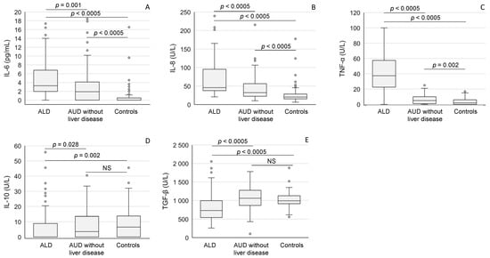 The mediators of inflammation (A: IL-6; B: IL-8; C: TNF-α; D: IL-10; E: TGF-β) in patients with alcoholic liver disease (ALD), and AUD without liver disease and in healthy controls. The data are expressed as medians and interquartile ranges. For abbreviations, see Table 2. NS = not significant.