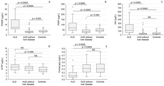The concentrations of serum markers of connective tissue metabolism ((A): PIIINP; (B): PINP; (C): HA; (D): ICTP, (E): CrossLaps) in patients with alcoholic liver disease (ALD), and AUD without liver disease and healthy controls. The data are expressed as medians and interquartile ranges. For abbreviations, see Table 2. NS = not significant.