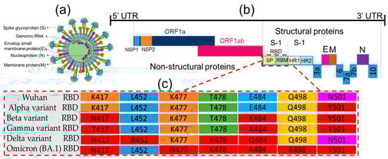 SARS-CoV-2 is an enveloped, spherical or pleomorphic, non-segmented, positive-sense, single-stranded RNA virus; it varies in size, ranging from 80 to 220 nm in diameter (Figure 1a) []. The viral genome codes for several structural (Figure 1b) and non-structural proteins (Figure 1b) [], among them glycoprotein structures, namely spike (S) protein, and non-glycoprotein structures, such as membrane protein (M), which reside in the virus.