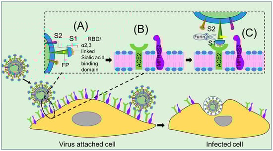 Nanostructural view of SARS-CoV-2 spike glycoprotein (S) and the potential mechanism underlying host cell fusion. (A) initiation of host-virus attachments involving S1,S2, FP of S protein and sialic acid binding domain, (B) ACE2 receptor and TMPRSS2 of hot cell, and (C) cell fusion through cleavage of furin protein.