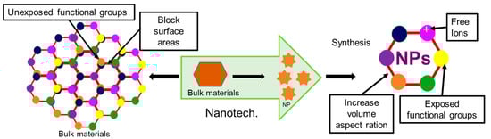 Nanotechnology is the method for controlling molecules below 100 nm scale for enhancing desired functionality. In the material world, nanomaterial lies in the scale of ≥1 nm to ≤100 nm. In the 21st century, nanotechnology has been considered the most attractive tool in many fields, including engineering, biology, chemistry, and physics []. Nowadays, nanomaterial science, electronics and nanoscale engineering (ENE), nano-agriculture, nanomedicine, nano-biotechnology (NBT), nano-robotics, nano-machines, and nano-toxicology have been established as branches of nanotechnology [,,,,,,]. Nanotechnology offers numerous advantageous features for many biomedical applications, like enhanced functionality through their increased volume aspect ratio and durability in action and targeted delivery through precise selectivity [,,] (Figure 3).
