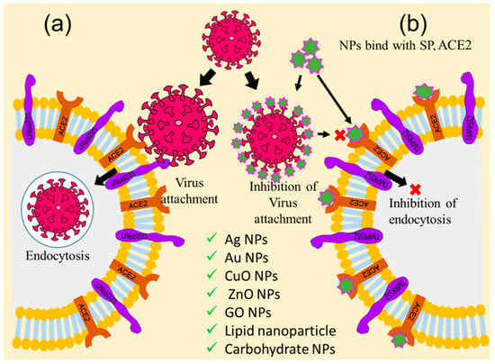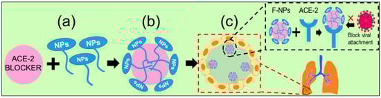 The suggested approach of targeted delivery of nanoparticles: (a) functionalized NPs will be conjugated to the drug or vaccine carrier, (b) drug-capped NPs will be carried to the targeted cells, and (c) ACE2 receptor of the most vulnerable lung cell will be blocked by the drug-capped NPs, which represents the nano-preventive approach for neutralizing virus in the viremia stage (‘×’ indicates inhibition checkpoint).