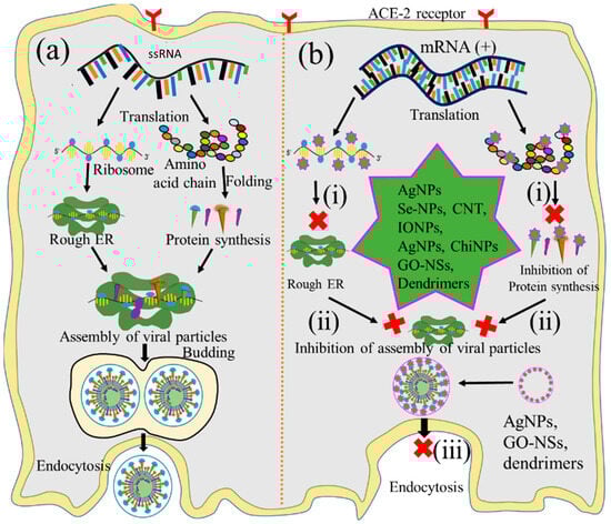 Recently, nanotechnology has emerged as one of the most promising technologies on account of its ability to deal with viral diseases in an effective manner, addressing the limitations of traditional antiviral medicines. It has not only enabled us to overcome problems related to the solubility and toxicity of drugs but also imparted unique properties to drugs, which in turn has increased their potency and selectivity toward viral particles against the host cells []. Overall, antivirals coated with nanoparticles offer several advantageous features compared to non-coated antivirals, like increased cellular uptake capability of drugs due to increased ion exchangeability of NPs, decreased doses of drugs due to precise selectivity of NPs through targeted delivery of drugs, increased cellular influx and decreased efflux, increased durability of action of Nanoparticle coated drugs through their slow release, and increased antiviral activity through targeted modification of functional groups [,,].