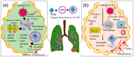 Many antiviral organic and inorganic nanoparticles, as well as their composite derivatives, have already been used as antiviral agents. Several antiviral drugs functionalized with nanoparticles, such as nano-capsules embedded with lipid nanoparticles and protein nanoparticles prepared from polymers, dendrimers, or micelles, have been applied as antivirals as well as vaccine carriers against cytomegalovirus, HIV, the Ebola, Zika, and dengue viruses, coronaviruses, HBV, and HCV [,,,,]. A number of drug nanocarriers have been introduced for other purposes, for example, lipid-based nanocarriers for targeted therapies [], RNA and protein nanocarriers for cancer and cellular niche therapy []. In the same way, tissue-specific drug carriers can be developed for the delivery of drugs against COVID-19 (Figure 12). Patients experiencing respiratory distress can be treated with a nanocarrier probed for lung tissue, while one probed for renal tissue or the cardiovascular system can be employed for patients experiencing renal or cardiovascular dysfunction. Such targeted delivery avoids not only unwanted exposure of unaffected systems to antivirals but also side effects.