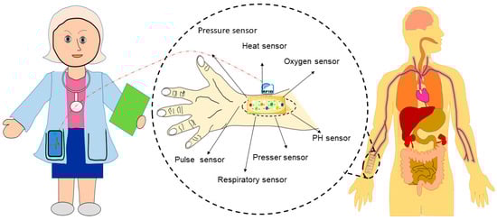 Wearable devices consisting of multisensory electrodes, including pressure, heat, oxygen, pulse, respiratory, and PH sensors, can measure body parameters such as pulse rates, pressure, or temperatures (Figure 9). Healthcare devices such as sensor patches (e.g., a band-aid adhesive patch used for glucose monitoring []), epidermal electronics (e.g., used to detect electrophysiological signals on the epidermis [,]), and contact lenses with embedded electronics (such as sensors, transmitters, and amplifiers used for health monitoring []) have recently attracted attention because of their potential to be applied in biomedical settings. Additionally, skin-equivalent sensors (such as the SkinEthicTM, Lyon, Franch, MatTek, Ashland, MA 01721, USA, StrataTech, St. Louis, MO, USA) [,] or bio-implantable sensors (such as specific absorption rate (SAR)), implantable blood pressure sensors, medical implant communication service (MICS), etc. [,]) combined with distance-monitoring devices could be useful for the diagnosis of COVID-19. However, applications of such devices are challenging due to inadequate interactions at the skin–device interface that lead to poor signal acquisition, and they are hence unfit for distance monitoring. Additionally, state-of-the-art devices often exhibit bio-incompatibility issues resulting from adverse tissue reactions, such as erythema, itching, and inflammation, which can cause severe discomfort for users. The signal acquisition efficacy of sensing devices is another challenging aspect that could, however, be tackled through in vitro and in vivo experimentation. The shelf life of such sensors also needs to be determined before they can be applied in real-life settings. Engineering solutions with biocompatible skin equivalent (SE)-embedded multi-electrode sensors that can establish biological communication between the skin and wearables and achieves the signal sensitivity necessary for monitoring clinical parameters of COVID-19 patients from a safe distance are therefore needed. Nano-biosensor-based wearable sensors, skin-equivalent electronics, epidermal electronics, and implantable sensors might be candidates for such distance monitoring devices. Nano-biosensor-based self-monitoring devices could serve as a TTT tool to identify symptomless carries among large populations and reduce horizontal virus transmission. Physicians and other healthcare personnel using such monitoring devices will be able to monitor patients with COVID-19 from a distance without being exposed.